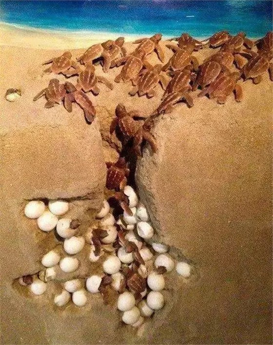 ▼陽(yáng)光燦爛的天氣,小海龜紛紛破殼而出,成群結(jié)隊(duì)的爬向大海。