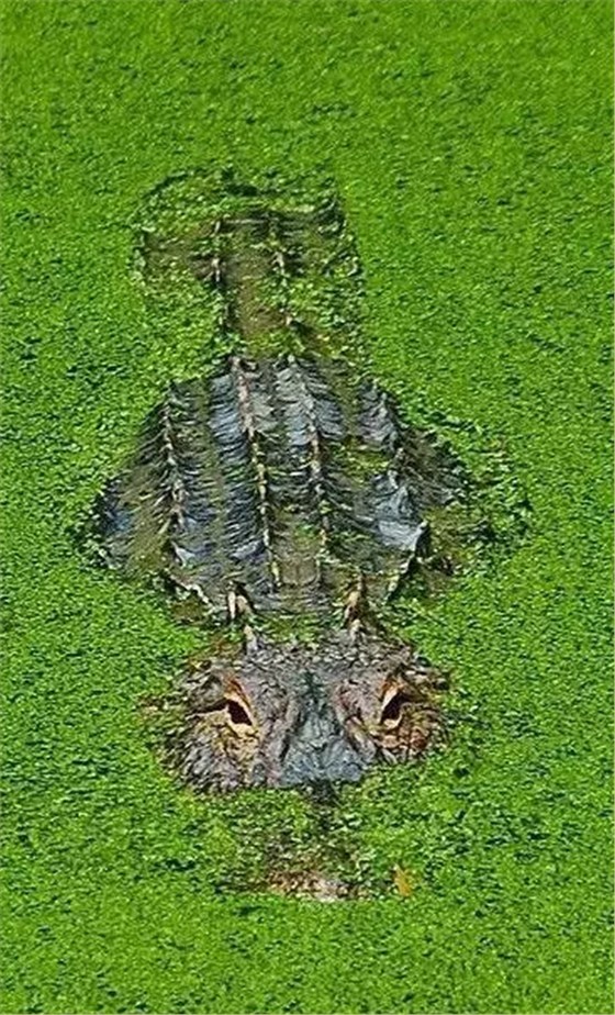 ▼躲在綠色的海藻中,只漏出眼睛和背部的鱷魚(yú)正全神貫注等待自己獵物的到來(lái)。