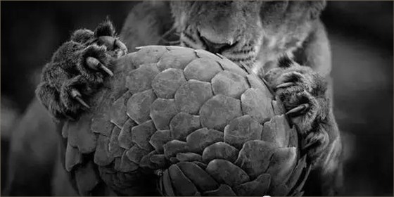 ▼一只老虎抓到一只穿山甲,想要吃掉它充饑,卻不知道從何處下口。