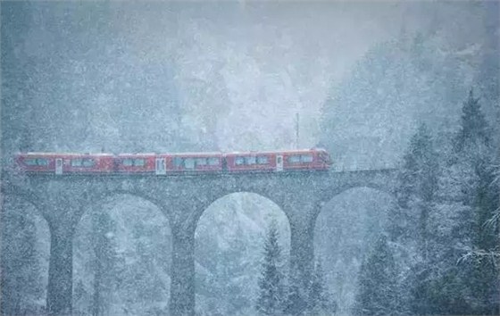 ▼瑞士下了一場(chǎng)大暴雪,火車迎著暴雪,在橋上艱難地前行著,猶如童話中的場(chǎng)景。