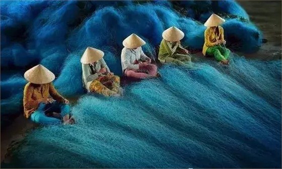▼中年女人們正排排坐著,安靜地整理捕魚(yú)的紗網(wǎng)。