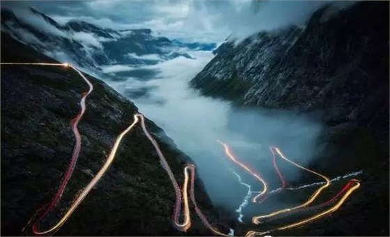 ▼挪威一座大山間的公路,夜幕降臨,蜿蜒的公里就像一條熒光閃閃的長(zhǎng)龍盤(pán)踞在山間。