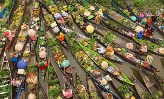 ▼在泰國(guó),菜市場(chǎng)不在地上而在水中,各種新鮮的水果和蔬菜被放在一條條狹窄瘦長(zhǎng)的小木船上進(jìn)行售賣。顧客買東西很有意思:要從這條船上跨到另外一條船上。