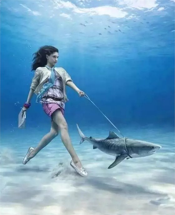 ▼一位衣著時(shí)尚的美女,左手牽著鯊魚(yú),右手拿著包包,這種海底逛街的方式真的太潮了!