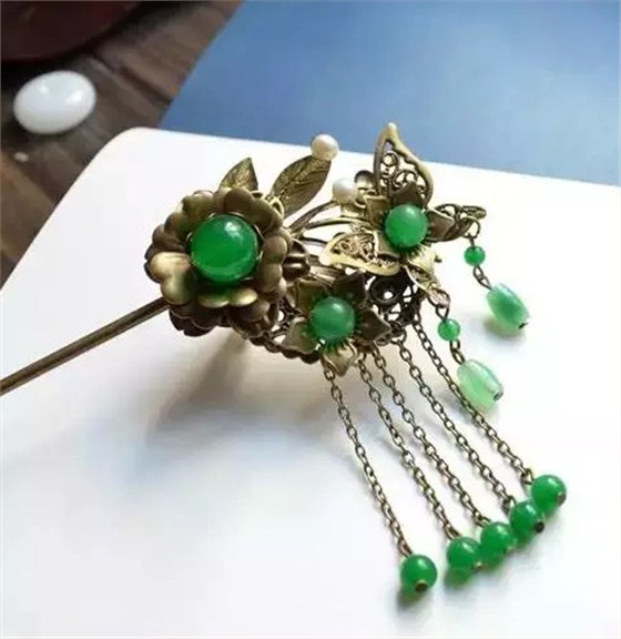 步搖是在頂部掛珠玉垂飾的簪或釵,是古代婦女插于鬢發(fā)之側(cè)以作裝飾之物,同時也有固定發(fā)髻的作用。一般形式為鳳凰、蝴蝶、帶有翅膀類的,或垂有旒蘇或墜子,走路的時候,金飾會隨走路的擺動而動,栩栩如生。取其行步則動搖,故名。