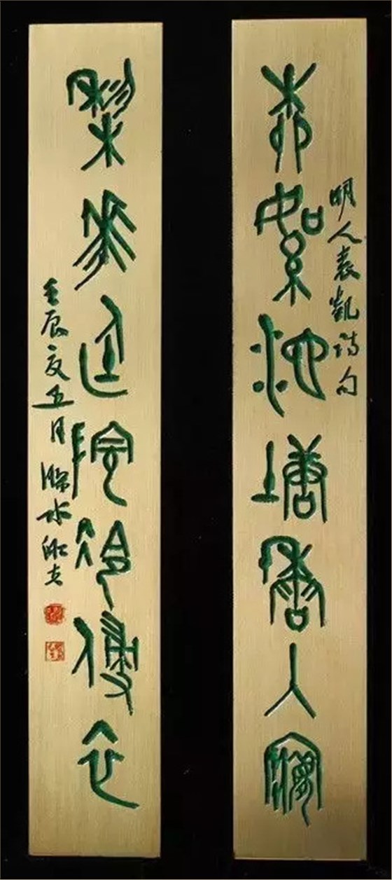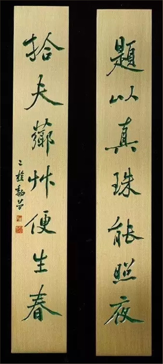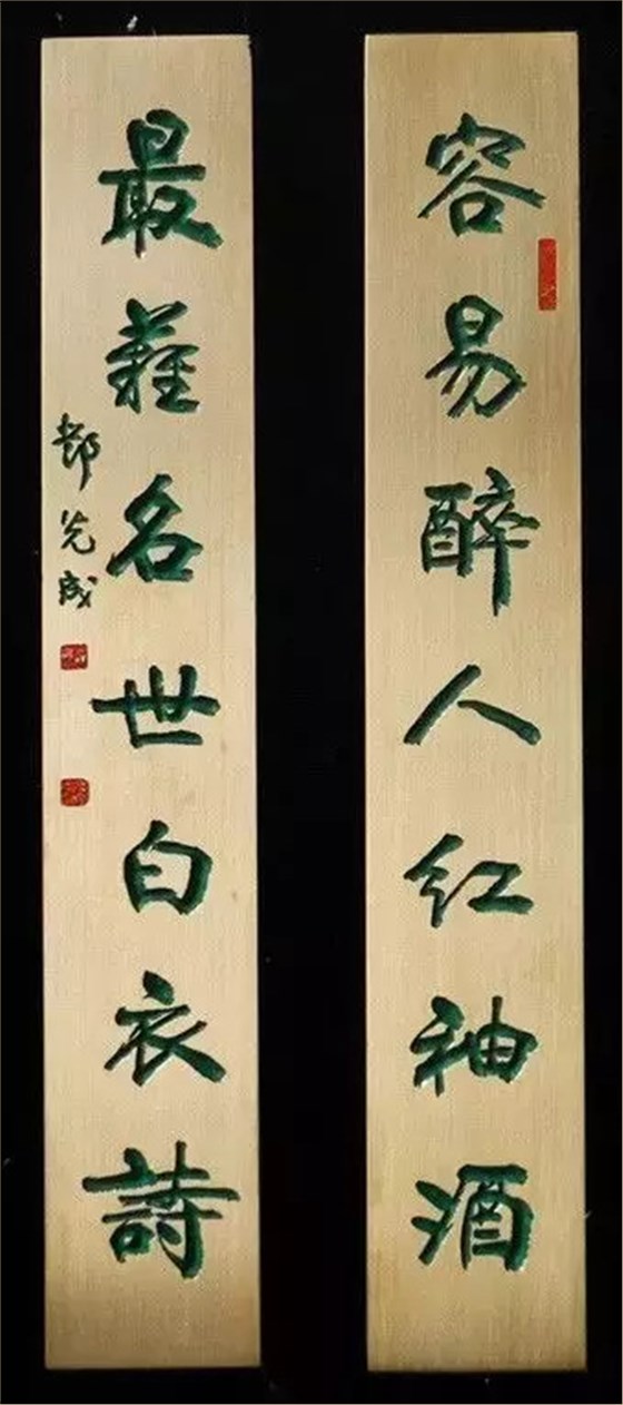 壓尺一般成對(duì)出現(xiàn),特別是長(zhǎng)方形的,一般成對(duì)的較多。這種形制的壓尺因?yàn)樾问狡胀ǎ嘣诒砻嫜b飾上下功夫,有的在一對(duì)壓尺上刻寫(xiě)對(duì)聯(lián),一字一畫(huà)等,左右相連時(shí)為一幅整畫(huà),分開(kāi)又可各自成幅。