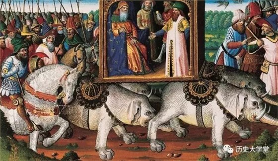 ▲忽必烈大汗坐在一個(gè)由四頭象載著的木制亭子中(《馬可•波羅游記》插圖)