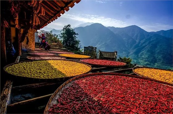 在湖南、江西、安徽等生活在山區(qū)的村民,由于地勢(shì)復(fù)雜,村莊平地極少,只好利用房前屋后及自家窗臺(tái)、屋頂架曬或掛曬農(nóng)作物。這種特殊的生活方式和場(chǎng)景,逐步成了畫家、攝影家追逐創(chuàng)造的素材,并塑造出詩意般的“曬秋”稱呼。