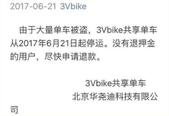 6月21日,共享單車平臺(tái)3Vbike對(duì)外宣布稱,由于單車大量被盜,即日起停止運(yùn)營。并提醒沒有退押金的用戶盡快申請(qǐng)退款。