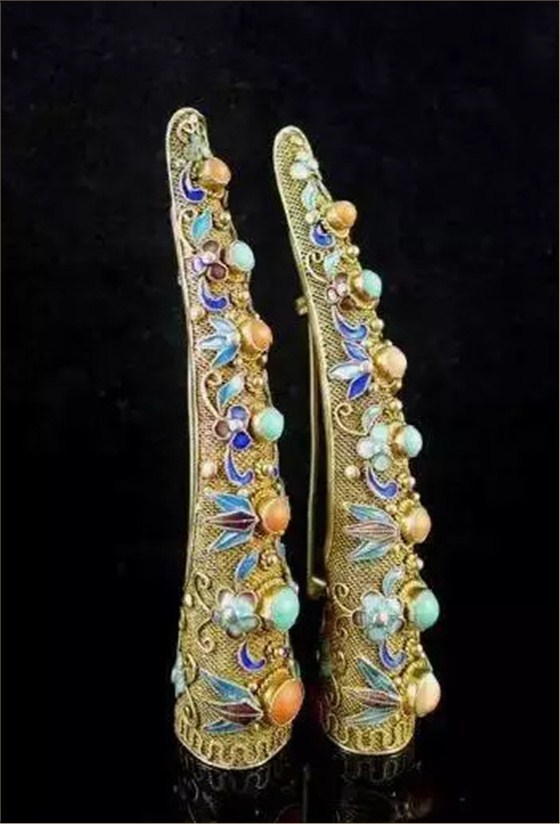 指甲套,護(hù)甲套、護(hù)指套。早就已出現(xiàn)。這一點(diǎn)被很多人忽視。只是到了清朝。后宮嬪妃用的就非常普遍了,樣式也繁密了許多。